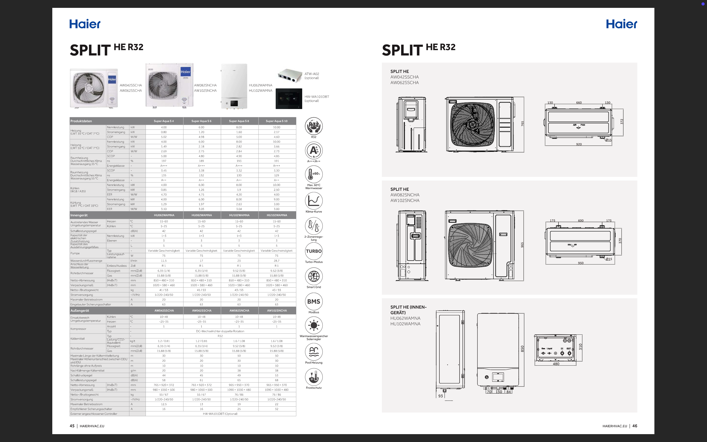 Hier kannst du das Datenblatt für die Haier SPLIT HE (R32) herunterladen und alle technischen Details auf einen Blick einsehen – von Kühl- und Heizleistung bis zu Features wie mehrere Inneneinheiten, Inverter-Technologie und integrierter Luftfilter.