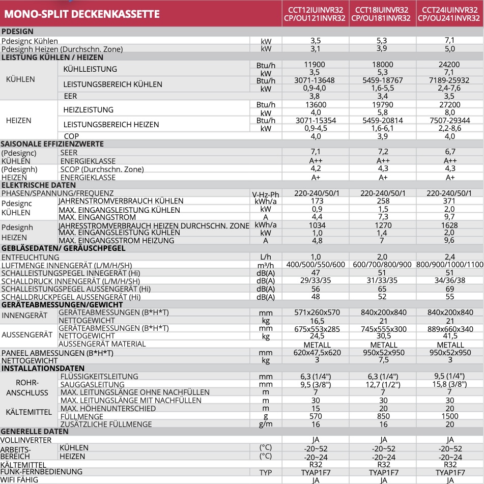 Hier kannst du das Datenblatt für den Toyotomi 8-Wege-Deckenkassette herunterladen und alle technischen Details auf einen Blick einsehen – von Kühl- und Heizleistung bis zu Features wie mehrere Inneneinheiten, Inverter-Technologie und integrierter Luftfilter.